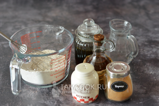На фото ниже - набор необходимых продуктов для приготовления постных блинов из цельнозерновой муки.