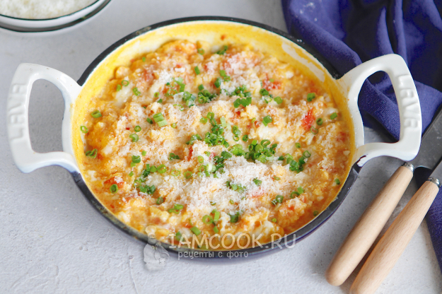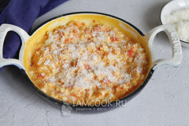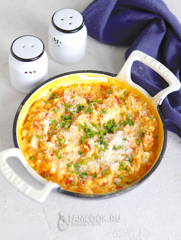 Наш завтрак из скрэмбла с сыром и помидорами готов.