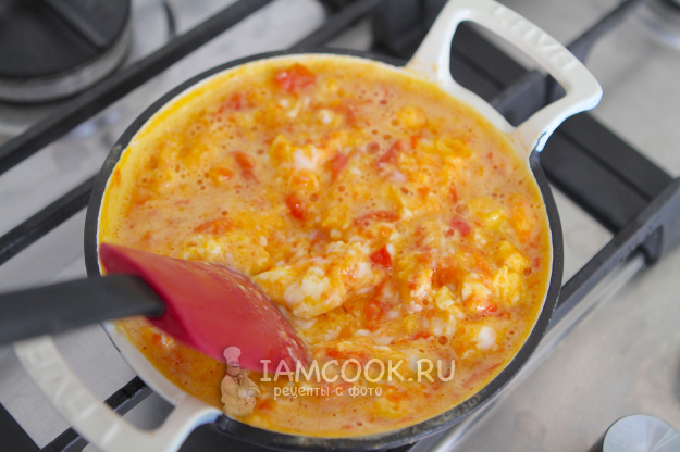 Примерно через 30 секунд начать перемешивать яичную смесь лопаткой, аккуратно поднимая массу со дна.