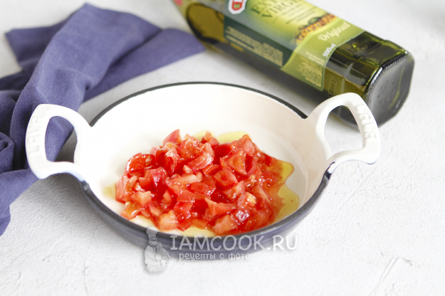 Помидоры ошпарить кипятком, снять кожуру и нарезать на небольшие квадратики.
