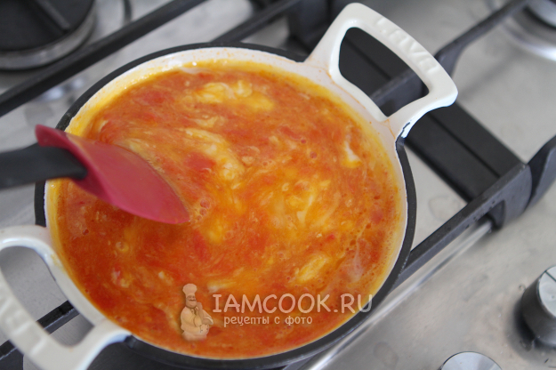 Для приготовления скрэмбла можно использовать любое масло: подсолнечное, оливковое, сливочное. Припустить помидоры до мягкости, буквально 2-3 минуты.