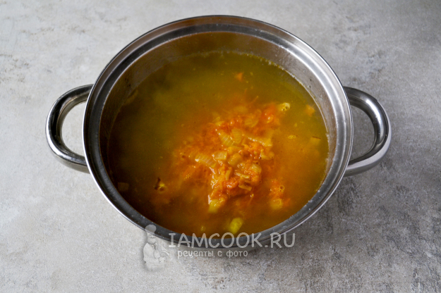 Положите тушеные овощи со сковороды в кастрюлю с картошкой. Посолите и доведите до кипения. Проварите пару минут.