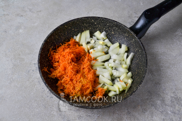 Пока картошка начинает вариться, натрите на терке морковь, лук нарежьте кубиком. Разогрейте сковороду с растительным маслом, положите лук с морковью.
