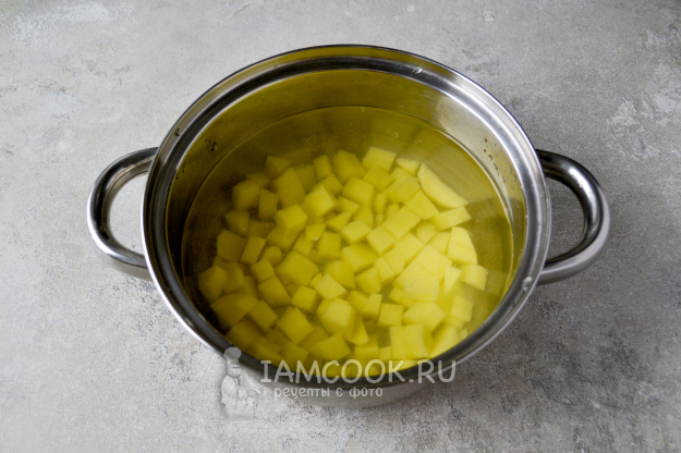 Картофель нарежьте кубиком, положите в кастрюлю, залейте холодной водой и поставьте на огонь.