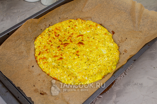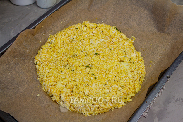 Противень выстелите пергаментом, выложите получившуюся смесь и сформируйте круг. Утрамбуйте тщательно руками.