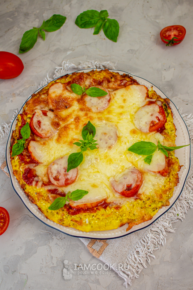 Украсьте базиликом, нарежьте на кусочки и подавайте кето пиццу из цветной капусты с курицей на стол. Приятного.