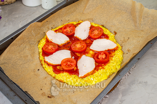 Смажьте основу томатным соусом, выложите нарезанные тонко курицу и помидоры.