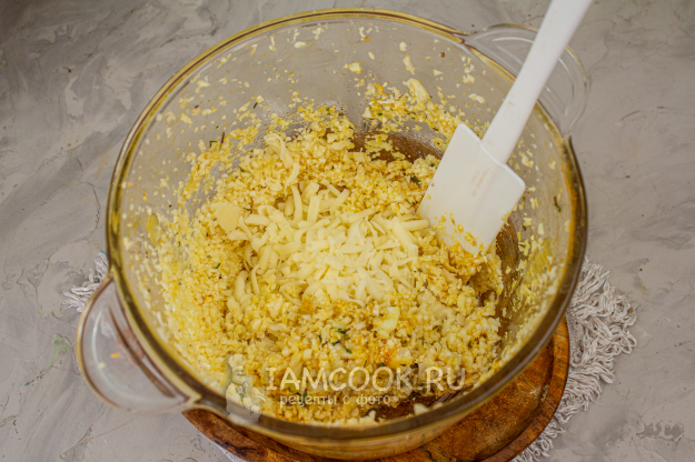 Измельчите капусту в мелкую крошку. Добавьте тертый сыр и тщательно перемешайте.
