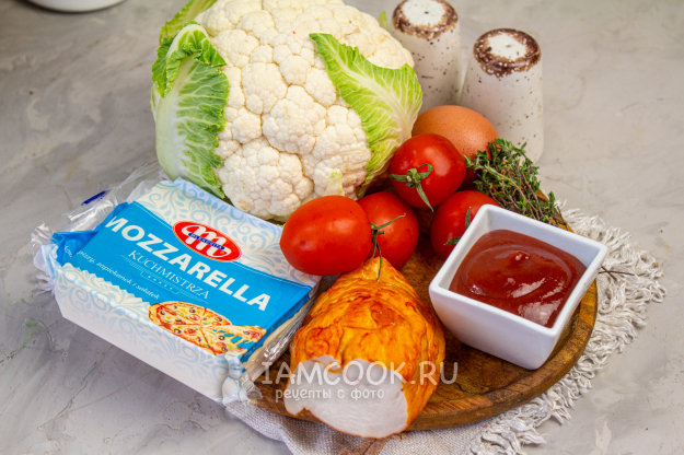 Подготовьте все продукты для кето пиццы из цветной капусты. Если используете замороженную капусту, то просто ее разморозьте и отожмите от лишней жидкости. В качестве соуса я использовала томатный соус без сахара. А в начинку добавила копченое куриное филе, которое можно заменить на бекон, колбасу или ветчину.
