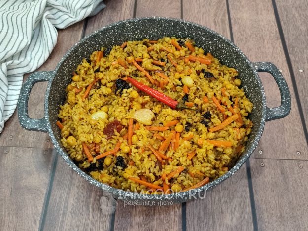 Накрываем крышкой, даем закипеть, убавляем огонь до слабого (4-5 из 9), готовим минут 12-15. Затем можно перемешать, снова накрыть крышкой, оставить еще минут на 5-7. Собственно, всё!)). Наш вкуснейший плов с нутом без мяса готов!!