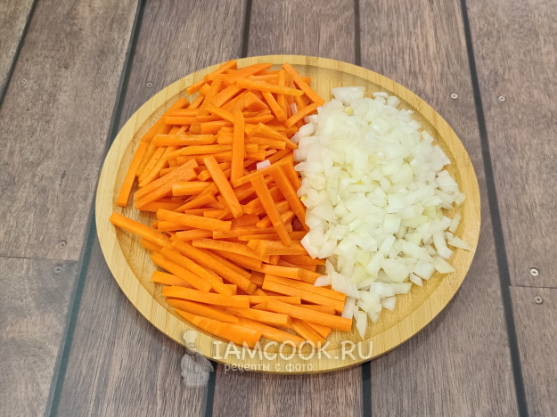 Нарежьте лук кубиком или недлинной соломкой. Морковь - брусочками, не слишком тонкими.