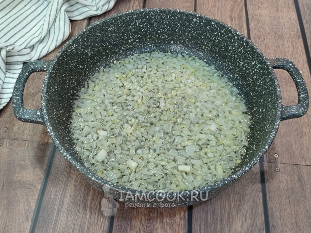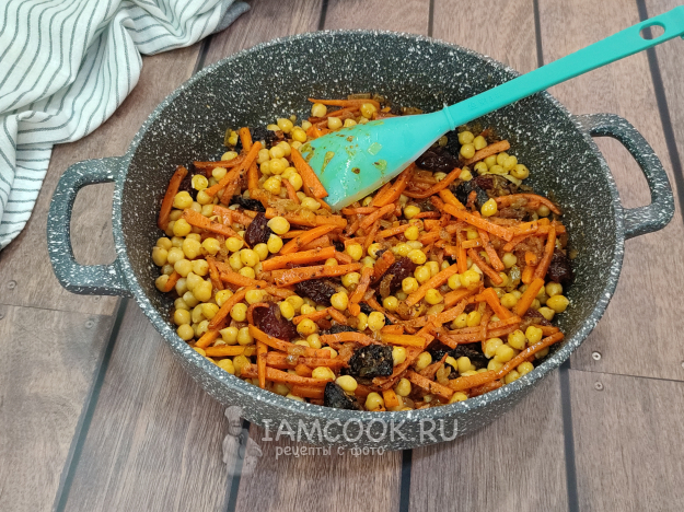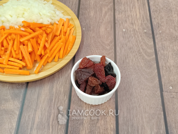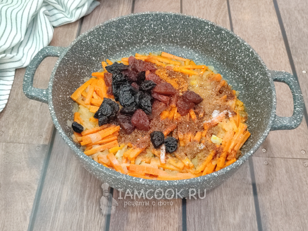 Когда лук станет прозрачным, добавляем морковь. Обжарим до мягкости и легкого румянца, всыпем специи, соль, выложим сухофрукты, перемешаем, обжарим еще пару минут.