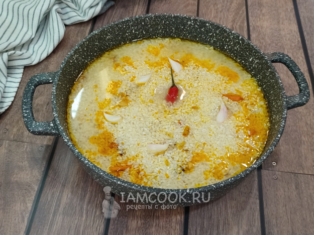 И, наконец, рис. Выкладываем, разравниваем, заливаем водой. На поверхность поднимается масло, и это правильно). Поместите дольки чеснока (можно его не чистить, а лишь тщательно помыть), острую перчинку для аромата.