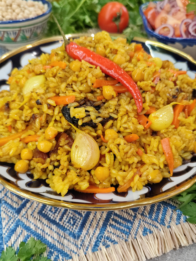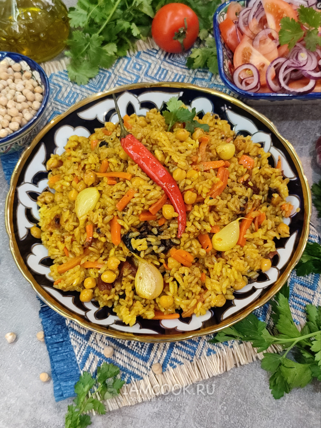 Как и к традиционному, подавайте к постному плову с нутом зелень, простой салат из помидоров и лука (ачик-чучук) или зеленой редьки.