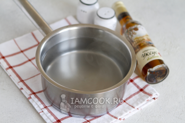 Готовить его мы будем самым классическим способом. Воду (1 литр) в сотейнике довести до кипения, посолить и ввести яблочный уксус.