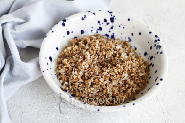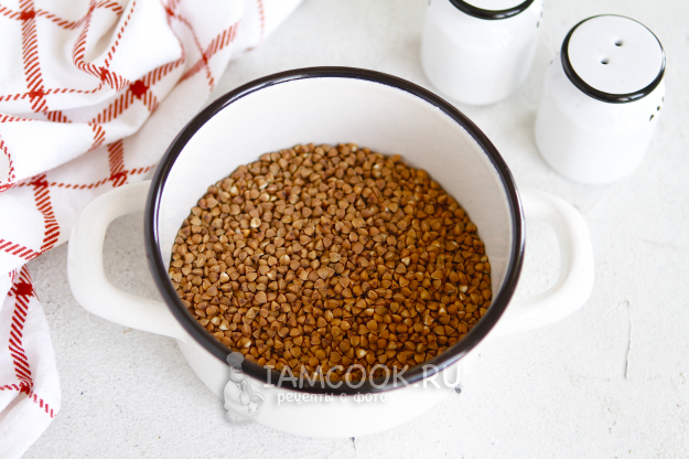 Гречневую крупу хорошо промываем под проточной водой. Откидываем на дуршлаг и перекладываем в кастрюлю или сотейник.