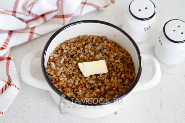Как только каша будет готова, добавляем кусочек сливочного масла. Кастрюлю закрываем крышкой и даем пропариться каше.