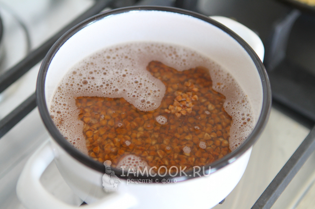 Добавляем воду. Доводим ее до кипения, солим. Варим гречку на среднем огне примерно 15-20 минут.