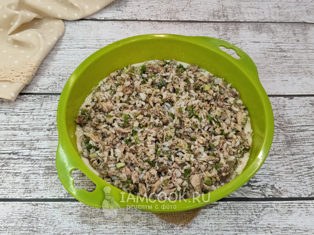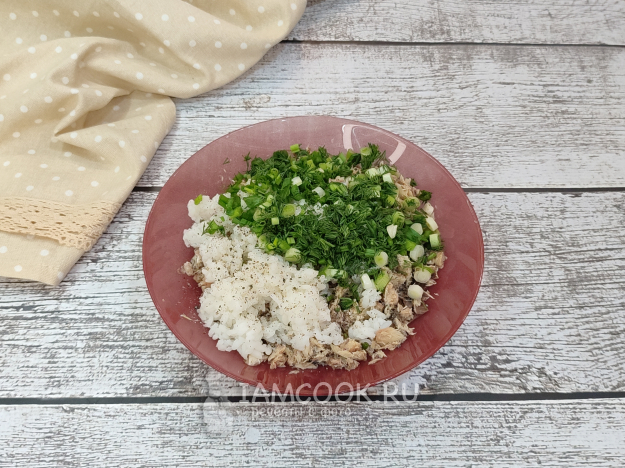 Духовку уже можно включать разогреваться до 180 градусов. Сначала сделаем начинку. Рыбу разминаем вилкой, добавляем рис, нашинкованную зелень, соль, перец по вкусу. Перемешиваем, и начинка готова!
