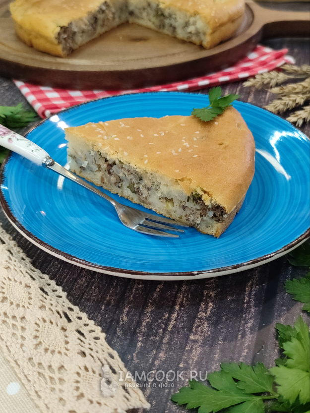 Оставшимся тестом покрываем верх пирога, разравниваем лопаткой. По желанию можно украсить семенами кунжута.