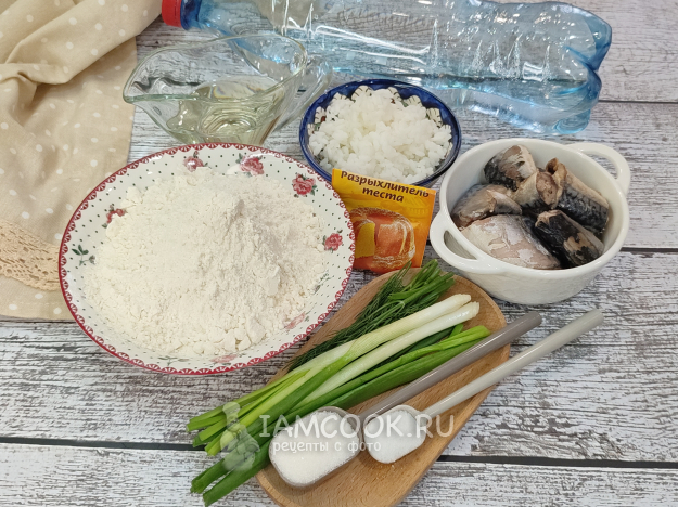 Подготовьте продукты для постного заливного пирога с рыбой. Рис можно заменить на гречку или перловку, например, можно вообще не добавлять крупу. Но с ней пирог будет сытнее.