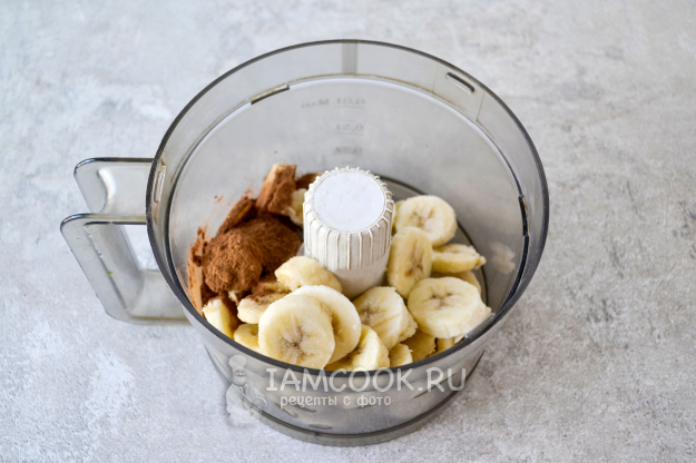 Установите насадку металлический нож. Замороженные кружочки бананов переложите в чашу блендера и всыпьте какао-порошок.