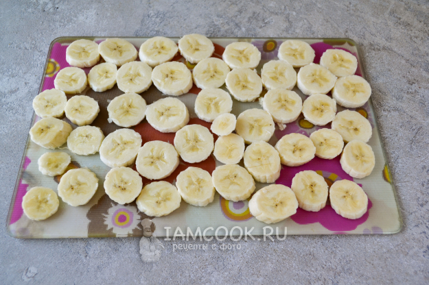 Бананы очистите, нарежьте тонкими кружочками, разложите на доске в один слой и поставьте в морозильную камеру на 3-4 часа, чтобы полностью застыли. Для заморозки можно воспользоваться разделочной доской, которую застелить пищевой пленкой для удобства отделения замороженных кружочков.