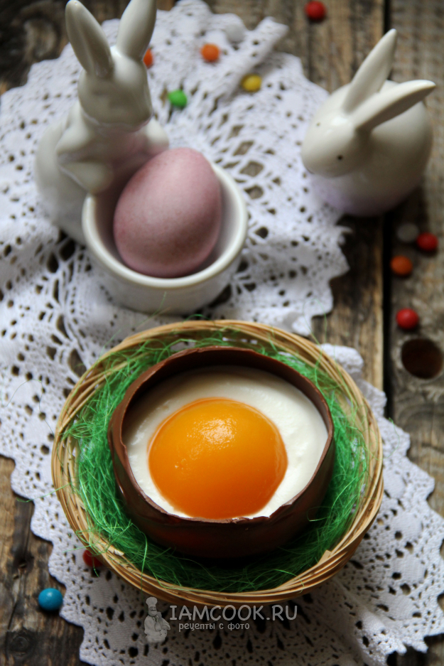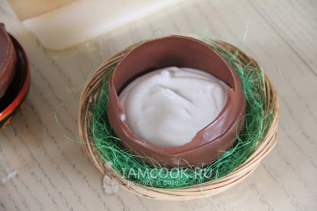 Шоколад растопить и окунуть шарик в шоколад, сформировав половинку скорлупки огромного яйца.