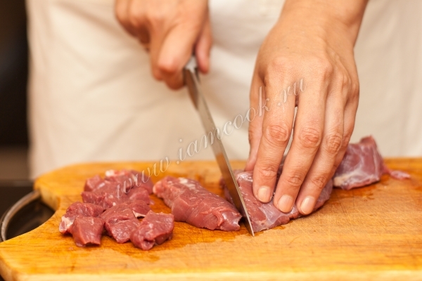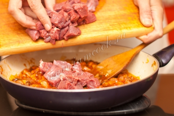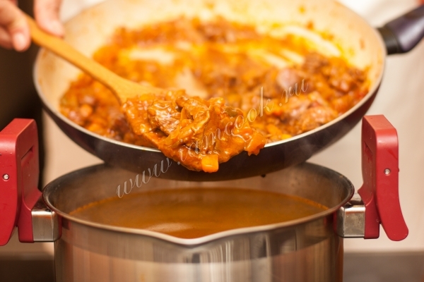 Накройте крышкой и тушите говядину на медленном огне втечение часа. Затем переложите в кастрюлю с кипящей водой.