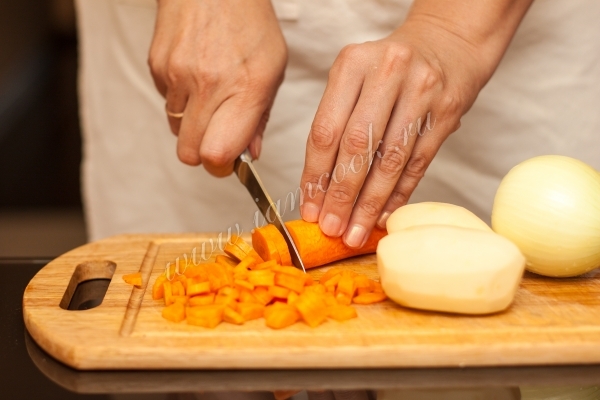 Почистите морковь, картофель и лук. Нарежьте овощи кубиками.