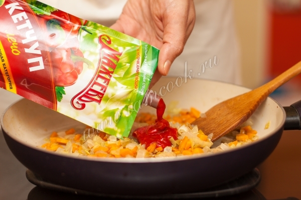 Вскипятите 2 литра воды. Отдельно налейте на дно кастрюли растительное масло и разогрейте его. Обжарьте лук и морковь до появления золотистого оттенка, добавьте кетчуп лечо «Махеевъ».