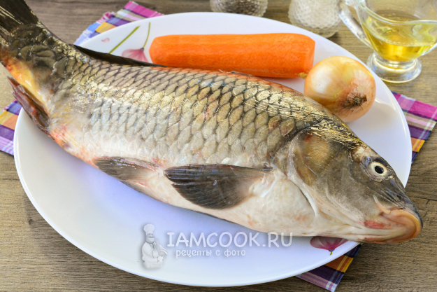 Соберите все продукты, необходимые для приготовления карпа в рукаве в духовке целиком.