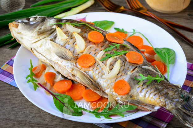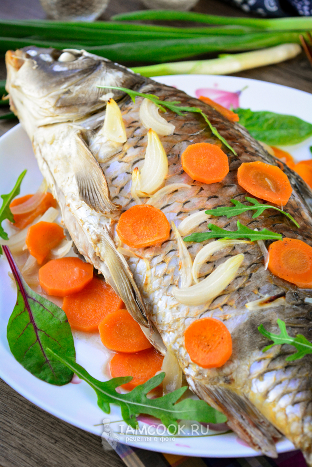 Запеченного карпа подавайте к столу. Блюдо полезное, вкусное и достаточно питательное. Для гарнира можете приготовить картофель или рис.
