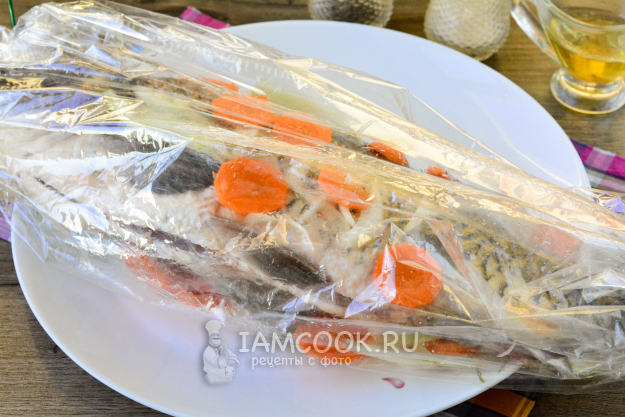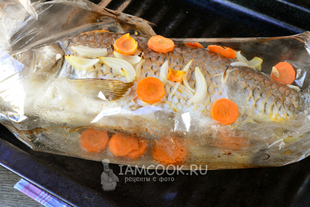 Карпа выложите в рукав для запекания, добавьте к рыбе нарезанные лук и морковь, влейте немного растительного масла. Все края рукава хорошенько завяжите.