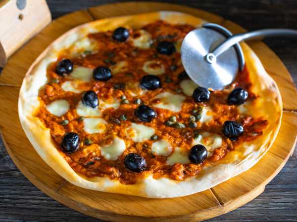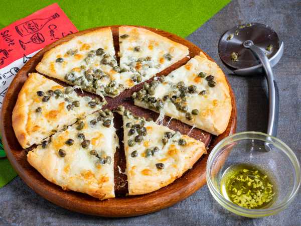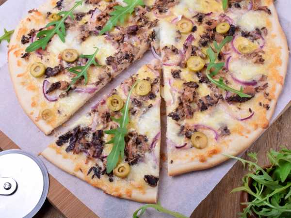 После 30 минут с помещения теста на противень включаем духовку на разогрев до 200 градусов и начинаем монтаж пиццы. Первым слоем поверх теста идёт слой сыра. Если вы не собираетесь выкладывать анчоусов так, чтобы их было видно, то рвите их на мелкие кусочки и распределяйте поверх сыра.