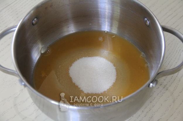 Апельсин хорошо помыть и выдавить из него сок. У меня получилось 120 мл сока. В кастрюлю влить апельсиновый сок и добавить сахар.
