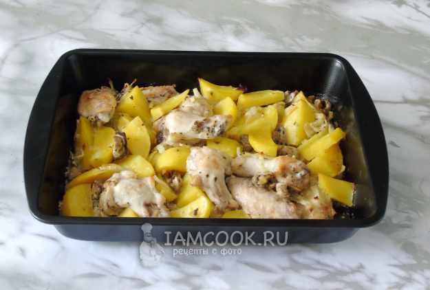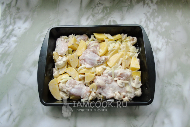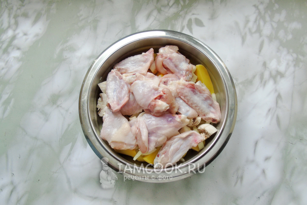 Куриные крылышки помойте и разрежьте на три сустава. Самый маленький уберите, а крупные выложите в миску с картошкой, луком и грибами.