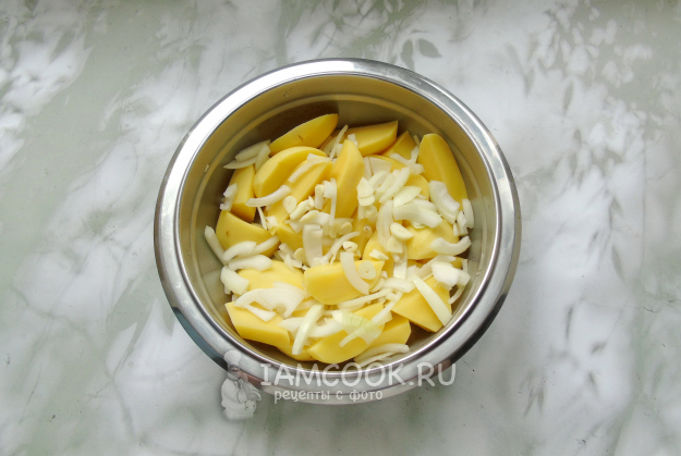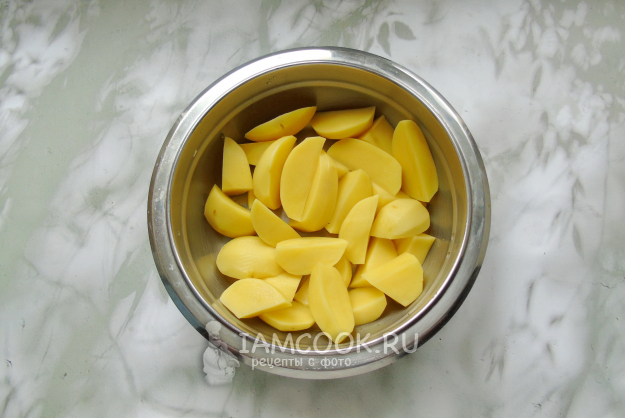 Картошку очистите, помойте и нарежьте дольками. Выложите в миску.