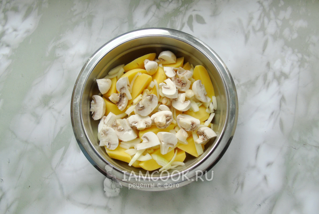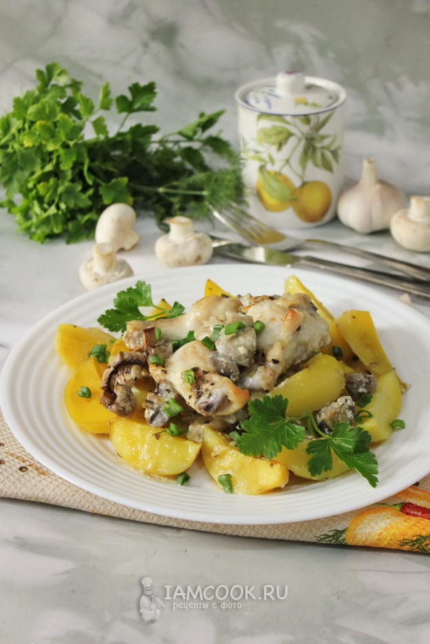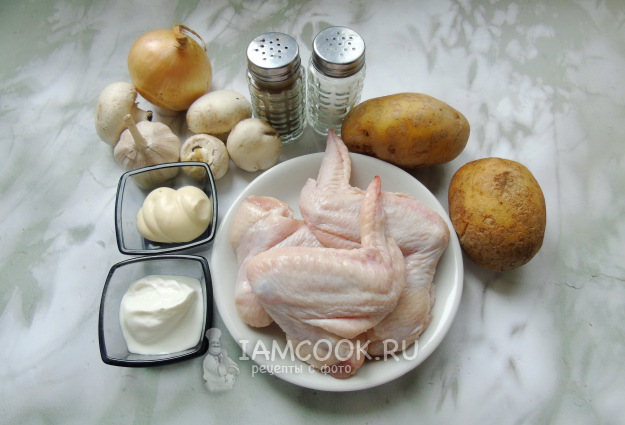 Соберите ингредиенты для приготовления картошки с крылышками и грибами в духовке.