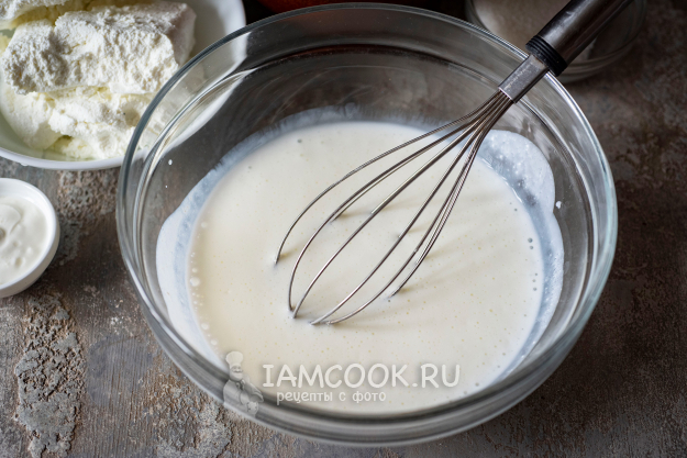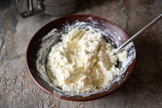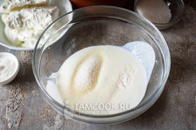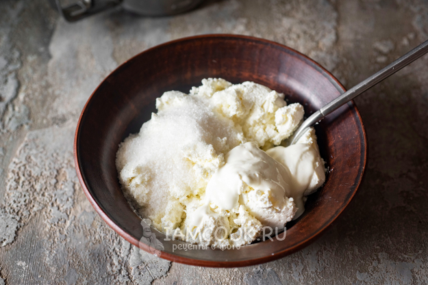 Приготовьте начинку. В миску выложите творог, добавьте сметану и сахар.