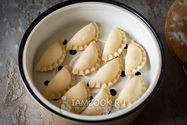 Порцию вареников приготовьте на пару. Я часть вареников выложила на дно перфорированной чаши для варки на пару в мультиварке, предварительно поверхность чаши я смазала растительным маслом, в керамическую чашу мультиварки я залила литр воды. Вареники я готовила в мультиварке на программе "На пару" в течение 20 минут.