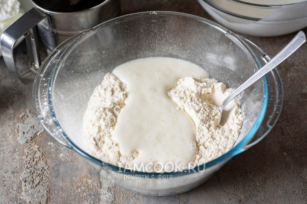 В миску залейте кефир, добавьте сахар, соль, соду.