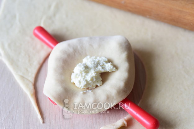 На центр каждого кружочка из теста выложите по 1 чайной ложке творожной начинки.