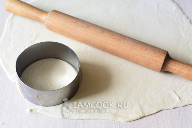 Тесто раскатайте в тонкий пласт и стаканом или кондитерским кольцом вырежьте кружки-заготовки.