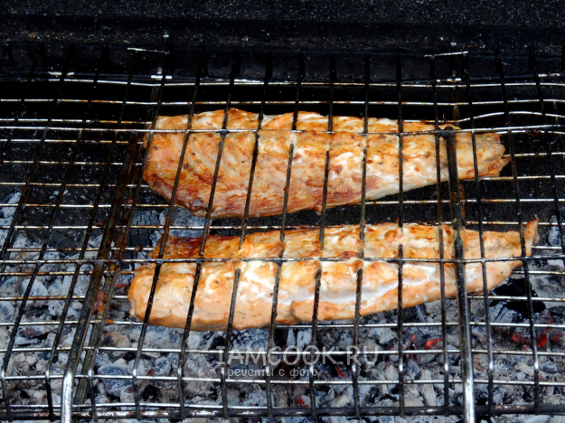 Когда скумбрия подрумянится, перевернуть решётку, подрумянить и с другой стороны.