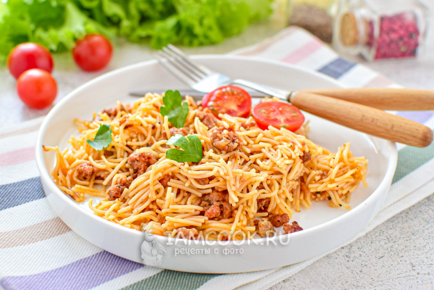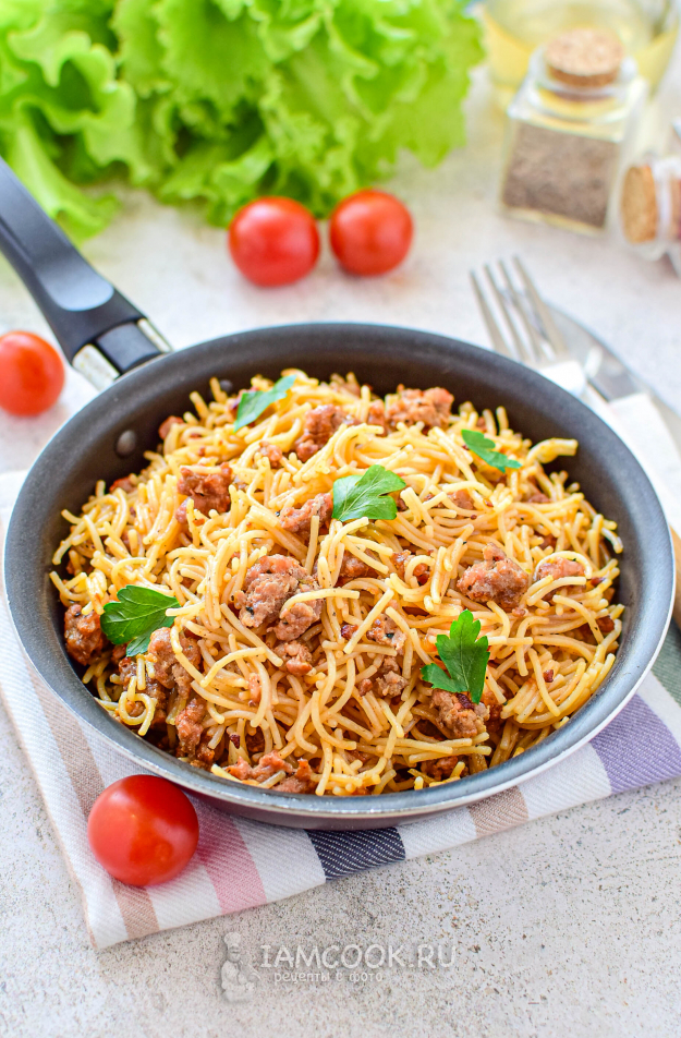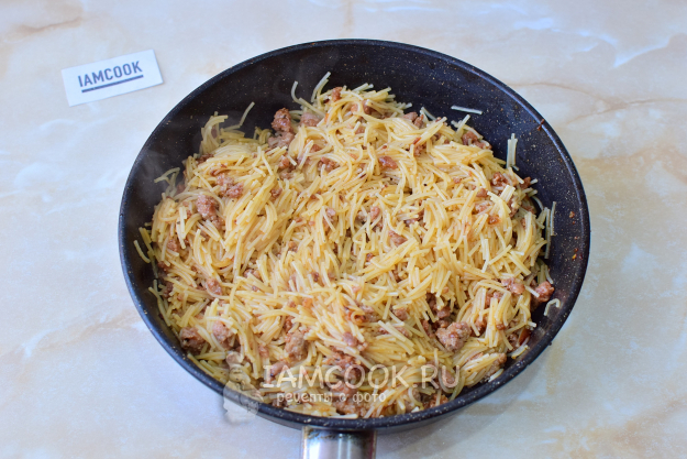 Прогрейте вермишель с фаршем на сковороде ещё 2-3 минуты и снимайте с огня.