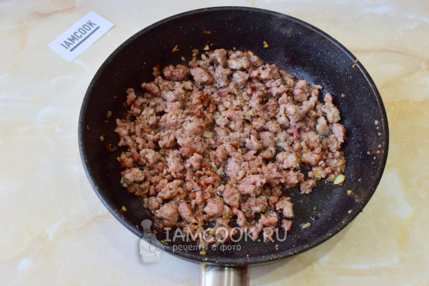 Следом выложите в сковороду фарш. Обжарьте его с луком 10-12 минут. По вкусу добавьте соль и специи.