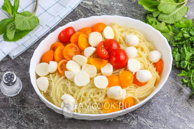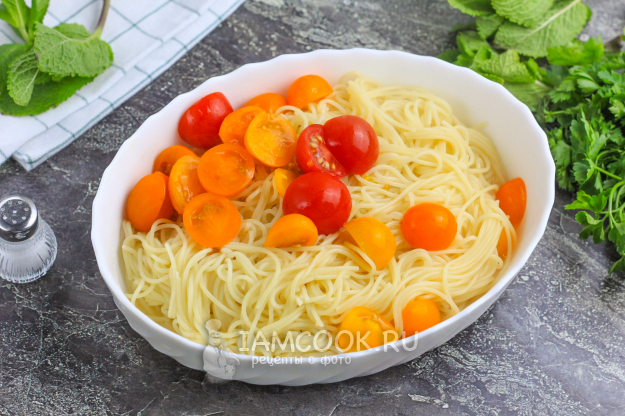 Сбрызните форму растительным маслом и выложите в нее спагетти, сначала откинув их на дуршлаг. Промойте черри и разрежьте пополам. Добавьте в форму.