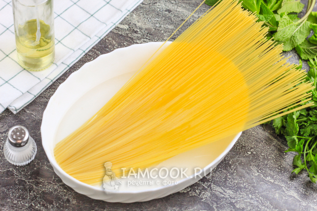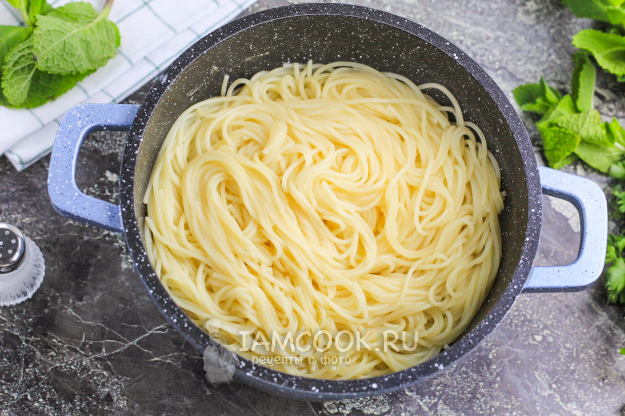 Отварите спагетти примерно 7-8 минут, до полуготовности, слегка присолив воду в емкости.