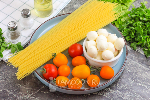 Продукты для приготовления пасты с моцареллой и черри в духовке - перед вами!